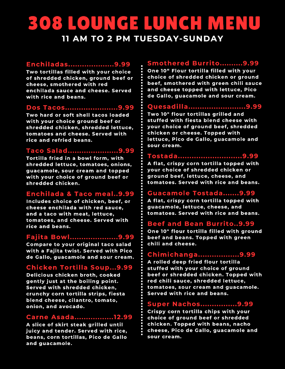 Welcome to 308 Lounge, a hidden gem nestled at 201 Chuckwagon Rd in Ogallala, NE. This inviting venue blends a cozy atmosphere with a diverse menu that caters to eclectic palates. With fast and attentive service, it’s an ideal pit stop for travelers along I-80.